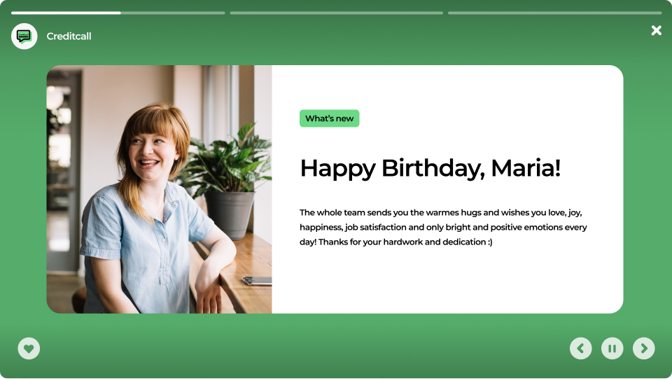 Already at the earliest stages of Workstories implementation it became possible to build a system of entertaining and engaging stories delivery — to congratulate the team on important events, broadcast success stories and wish a productive day every morning.